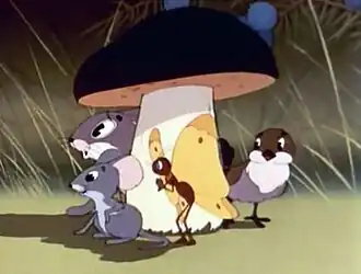 | Роли озвучивали: | Зинаида Бокарёва — Заяц, Ирина Потоцкая — Муравей, Агарь Власова — Воробей, Елена Понсова — Лиса / лягушка, Галина Новожилова — Бабочка, Леонид Пирогов — Грибок-теремок, Г. Сапожникова — Мышка, Серафим Аникеев — Кузнечик (нет в титрах) |