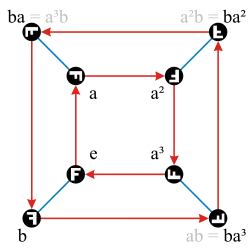 Заметим, что i, j и k имеют порядок 4 в Q и любые два из них порождают всю группу. Другое задание группы Q[4], показывающее это: