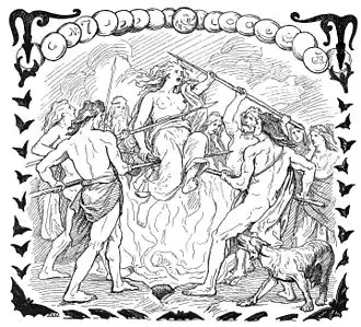 - Сага "Прорицание вёльвы" (Völuspa) из сборника "Старшая Эдда" строфа 21: Помнит войну она первую в мире: Гулльвейг погибла, пронзенная копьями, жгло ее пламя в чертоге Одина, трижды сожгли ее, трижды рожденную, и все же она доселе живет.[5]