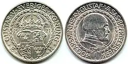 2 кроны 1921 года — шведская памятная монета с портретом Густава I, отчеканенная по поводу 400-летия освобождения Швеции от датского господства.