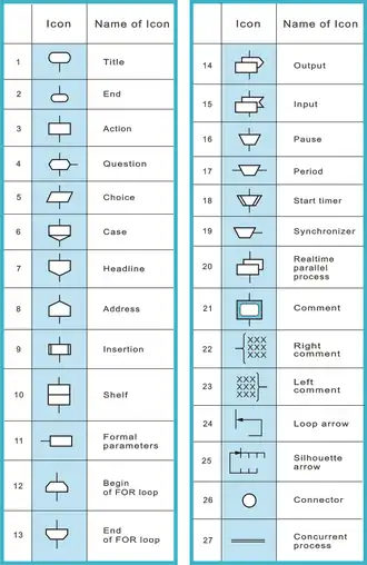 - графические фигуры (icons, они же иконы, они же представленные в виде окружающих текстовые части программы (см. также: Картуш) геометрических фигур операторы языка);