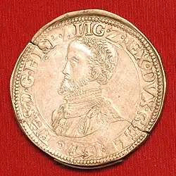 В 1583 году в Дордрехте был выпущен рейксдальдер с погрудным портретом лидера войны за независимость северных провинций Вильгельма I Оранского с мечом. По этому изображению монета получила обиходное название «дальдер принца» («княжеский дальдер»), сохранившееся за всеми рейксдальдерами этого типа. Другое название монеты — «рейксдальдер со шлемом», полученное по отчеканенному на другой стороне шлему, под которым располагался гербовый щит[26][27].