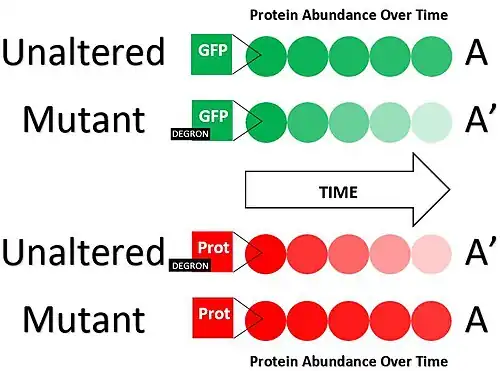 Существует три подхода, позволяющие идентифицировать дегрон в белке[2][18][19]. В первом методе последовательность, являющаяся вероятным дегроном, пришивается к стабильному белку (например, GFP), и далее сравнивается стабильность исходного белка и белка с пришитым вероятным дегроном[20]. Если пришитая последовательность действительно является дегроном, число молекул белка, к которому она пришита, будет со временем снижаться гораздо быстрее, чем в случае исходного белка[9][10][11]. Кроме того, из белка можно удалить последовательность, которая, вероятно, является дегроном, и сравнить стабильность белка с делецией с исходным белком. Если удалённая последовательность является дегроном, белковые молекулы, лишённые её, окажутся стабильнее исходного белка[9][10][11].