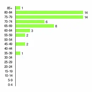 | Жителей | 801 | 879 | 850 | 621 | 403 | 189 | 143 | 94 | 51 |