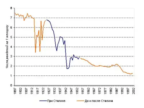 Рождаемость в СССР, в частности, среди европейских народов и республик, сначала упала ещё в 1967 ниже уровня воспроизводства населения (2,1 рождения на одну женщину), а с 1992 года в России — ниже уровня смертности.