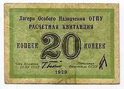 На лицевой стороне сверху помещалась надпись: «Лагери Особого Назначения ОГПУ / Расчётная квитанция». Далее следовало указание номинала. Ниже были помещены факсимильные подписи члена коллегии ОГПУ СССР Глеба Бокия и начальника финотдела ОГПУ Лазаря Берензона.