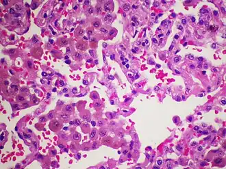 Ключевым признаком данного заболевания является содержание большого количества макрофагов в просвете альвеол. Альвеолярные перегородки инфильтрированы лимфоцитами, эозинофилами, иногда мезенхимальными клетками, однако, фиброз либо отсутствует, либо выражен не значительно[5]. Поражена практически вся легочная паренхима[3].