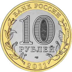 Центробанк РФ выпускает памятные монеты из недрагоценных металлов номиналом десять рублей в сериях «Древние города России» (с 2002 года), «Российская Федерация» (с 2005 года), «Города воинской славы» (с 2011 года), а также на разные исторические события.