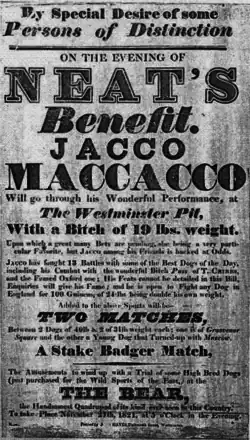 Джакко Макакко, знаменитая обезьяна, будет сегодня драться с белой сукой Тома Криббса, Пусс. Джакко провёл много боёв с некоторыми из известных собак и победил их всех, и он поэтому способен бороться с любой собакой в Англии, весящей в два раза больше него[7].