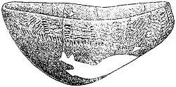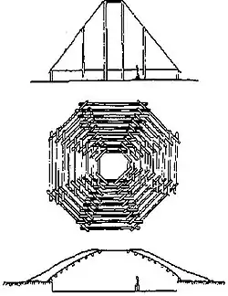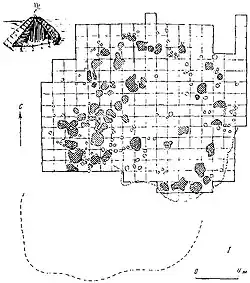Крыша не доходила до земли. Судя по густоте массы сгоревшего материала по краю, край крыши опирался па невысокую стену. Над входом был небольшой камышевый навес.[4]