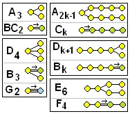 Наконец, двойственность диаграмм соответствует изменению направления стрелок, если таковые есть:[8] Bn и Cn двойственны, в то время как F4 и G2 самодвойственны, поскольку являются однониточными ADE диаграммами.