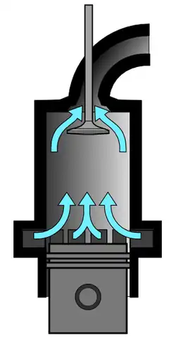 - 1-й такт. Впуск. Соответствует 0°—180° поворота коленвала. Через открытый приблизительно на 345—355° впускной клапан воздух поступает в цилиндр, на 190—210° клапан закрывается. При этом до 10—15° поворота коленвала одновременно открыт и выхлопной клапан. Время совместного открытия клапанов называется перекрытием клапанов, при котором происходит продувка цилиндра сжатым воздухом (адиабатически сжатым в турбокомпрессоре и охлаждённым изобарно в интеркулере для снижения удельного объёма и увеличения соответственно количества окислителя, подаваемого в цилиндр, и также снижения работы, затрачиваемой на такте сжатия) из впускного коллектора для удаления продуктов сгорания.
