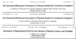 В 1935 году Эйнштейн, Борис Подольский и Натан Розен опубликовали статью под названием «Можно ли считать, что квантово-механическое описание физической реальности является полным?»[8]. В ней они анализировали поведение системы, состоящей из двух частей, которые взаимодействовали в течение короткого промежутка времени. Прежде чем перейти к этому аргументу, необходимо сформулировать ещё одну гипотезу, которая вытекает из работы Эйнштейна в теории относительности: принцип локальности. «Элементы физически объективно наблюдаемой реальности не могут подвергаться мгновенному действию на расстоянии».