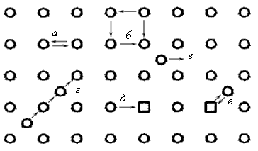 Основными механизмами перемещения атомов по кристаллу могут быть: прямой обмен атомов местами — а; кольцевой обмен — б; перемещение по междоузлиям — в; эстафетная диффузия (краудион) — г; перемещение по вакансиям — д; диссоциативное перемещение — е; миграция по протяженным дефектам (дислокациям, дефектам упаковки, границам зерен).