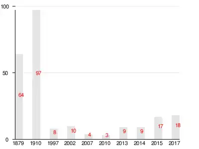 | 1997[15] | 2002[16] | 2007[17] | 2010[18] | 2013[19] | 2014[20] | 2017[1] |