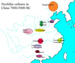 Неолитическая культура Синлунва (6200—5400 годы до н. э.) — самая ранняя археологическая культура Китая, использовавшая предметы из жада и рисунки драконов. Гончарные изделия Синлунва были в основном цилиндрическими и обжигались при низких температурах. В нескольких кувшинах из Цзяху обнаружены следы алкогольных напитков, полученных при ферментации риса, мёда и некоторых местных растений. Памятники культуры Ананси (Aang’angxi) в Северной Маньчжурии составляют одну археологическую общность с ранненеолитическими памятниками так называемой новопетровской «культуры пластин» на Среднем Амуре[63].