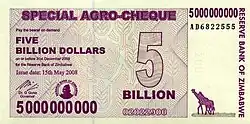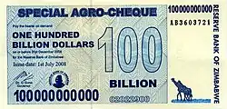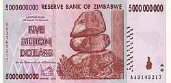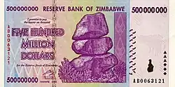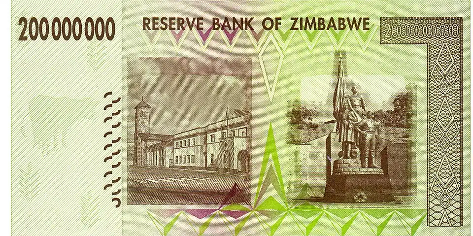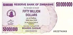 По официальным данным, за год инфляция достигла 231 млн % (на июль 2008). Согласно экономисту Стиву Ханке, в октябре 2008 года цены удваивались каждые 24,7 часа, что соответствует годовой инфляции в 6,5 квинкватригинтиллионов % (то есть 6,5⋅10108 %)[3][4]. Например, банка пива 4 июля 2008 года в 17:00 по местному времени стоила 100 млрд зимбабвийских долларов, уже через час она стала стоить 150 млрд[5].