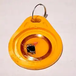 - Ключ. Замок открывается ключом, который подносится к считывающему устройству. Ряд должностных лиц обладает универсальным ключом от домофона (например сотрудники полиции и МЧС, скорой медицинской помощи, аварийной службы газовой сети, почтальоны).[14]