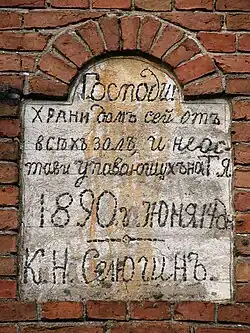 Здание перекрыто двухскатной шиферной кровлей по деревянным стропилам. Западный и восточный фасады глухие. С восточной стороны к жилому дому примыкает наиболее старый элемент комплекса — одноэтажный кирпичный лабаз с оштукатуренными стенами. Западная стена лабаза была использована при строительстве жилого дома. С запада к жилому дому примыкает протяжённое одноэтажное здание магазина, построенное, вероятно, несколько позднее. Отделка его уличного фасада стилистически близка к архитектуре жилого дома. Во дворе находится небольшой одноэтажный кирпичный складской павильон, также выполненный в едином стиле с жилым зданием. Размеры жилого дома в плане 13,7 х 15 м[1].