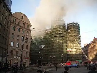 - ↑ Пожар в «Доме с башнями» Архивная копия от 19 июня 2010 на Wayback Machine / Карповка.нет