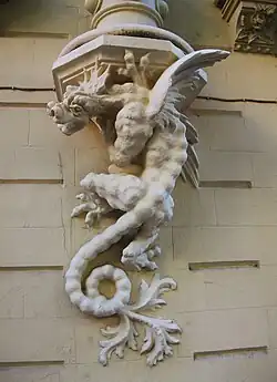 Архитектоника Дома с драконами тяготеет, скорее, к классицизму, о чём свидетельствует его чёткая осевая симметрия, явно выраженный композиционный центр и вертикальное членение боковых фасадов, обрамлённых ризалитами из белого камня. Отделка же здания следует канонам архитектуры модерна, демонстрируя исключительно богатое и разнообразное оформление. Прямоугольные мерлоны на парапете крыши отсылают к романской архитектуре, круглое окно с крестоцветом в центре углового фасада — явный атрибут готики. Карниз второго этажа и капители колонн украшены цветочным орнаментом.