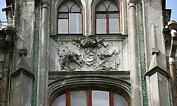 | Зеленоглазая кошка, стерегущая окно | Две совы над дверью | Чёрт или Химера на самом верху, под крышей | Фамильный герб, расположенный под Чёртом | Четыре мужских маскарона: 2 грустных, 2 злых |