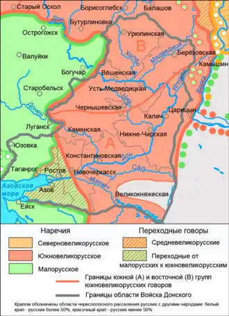 - ↑ Территория распространения говоров Донской группы соответствует в общих чертах территории области Войска Донского — административной единицы Российского государства до 1918 года.