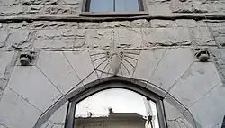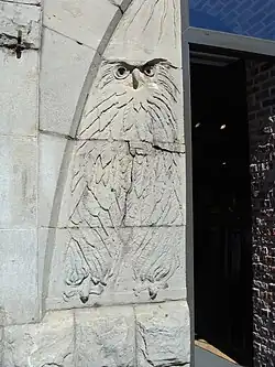 По центральной оси в целом спокойно выглядящий каменный фасад «разламывается» контрастным трёхгранным стеклянным эркером. Витрины первого этажа также объёмные, их перекрытие, двутавровые балки, обнажено. Нижний ярус облицован талькохлоритом[3] скальной и гладкой фактуры[1] и играет роль цоколя. Последний этаж заглублён, но центральная часть выделена выступом с изогнутыми боковыми стенками, фронтоном и полукруглым окном[3]. На верхнем этаже и лестнице со стороны двора окна шестиугольные, обрамления входов украшены рельефами — натуралистичными взъерошенными филинами слева и условными хищными птицами, переходящими в узор, справа. Здание ранее было поверху украшено лепниной, мезонин украшали женские фигуры[1], от которых остались овальные венки и панно с лебедями. Межэтажные пояса эркера украшены майоликой с цветами[4].
