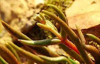 Этот вид является эндемиком южной Калифорнии, где встречается редко и становится все более редкой по мере изменения среды её обитания. У растения несколько коротких, пальцеобразных цилиндрических листьев с заостренными кончиками. Преобладает прямостоячий цветонос, увенчанный разветвленным соцветием, на каждой длинной тонкой ветке которого находится до 15 цветков. Цветки имеют заостренные желтые лепестки и длинные тычинки.