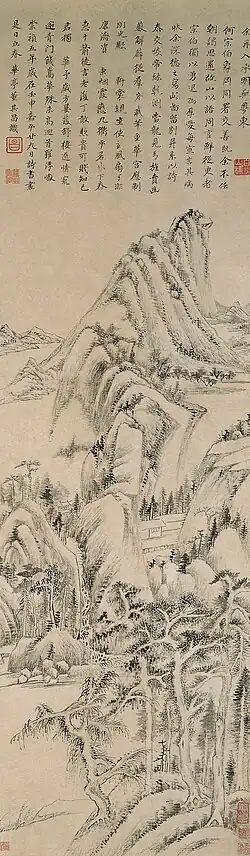 Пейзаж Дун Цичана в известной мере иллюстрирует его теории. В частности, сходство со старинной живописью отражает один из его постулатов о необходимости учиться у древних мастеров. Но среди его пейзажей есть произведения, в которых надпись не соответствует изображённому.