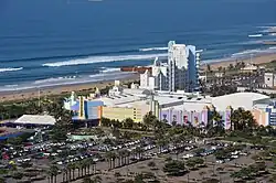 По часовой стрелке слева вверху: Durban CBD, Ushaka Marine World, Казино «Солнечный берег» и развлекательный центр, Мозес Мабида (стадион), en:Inkosi Albert Luthuli International Convention Centre и Durban City Hall. | ||||||