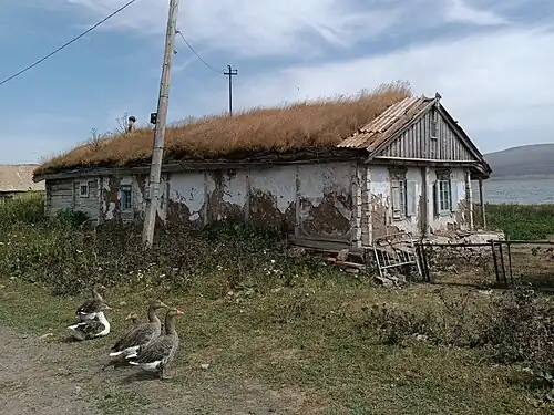 Кровля — главное отличия духоборского дома от украинского или южнорусского. Хаты имели не традиционную двускатную, а низкую мансардную кровлю с плоской перемычкой между скатами. Такая кровля покрыта большим слоем дёрна, на котором росли травы. Дёрновое покрытие кровель не характерно для русской архитектуры: такое решение широко применялось в странах Скандинавии и в отдельных регионах северной России, оно отлично сохраняет тепло в условиях холодного климата. Но выходцы из южных губерний, духоборы не могли знать о подобной технологии, поэтому их “зелёные” крыши — собственная инновация, адаптирующая южную мазанку к морозам. Именно необходимостью удержать большое количество грунта можно объяснить такую пологую, практически плоскую форму скатов кровли. Из-за невысокой высоты кровли отсутствовал чердак, поэтому внутренние помещения имели сводчатый потолок.