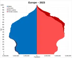 Рост населения в Европе медленный по сравнению с другими частями света из-за, среди прочего, низкого уровня рождаемости. Южная и Западная Европа — регионы с наибольшим средним числом пожилых людей в мире, сегодня они составляют 21 % населения старше 65 лет[35]. Прогнозы показывают, что к 2050 году Европа достигнет 30 %[36]. Это вызвано тем, что с 1970-х годов население рожает детей ниже уровня воспроизводства. По прогнозам Организации Объединённых Наций, в период с 2022 по 2050 год население Европы сократится на −7 % без изменения иммиграционных потоков[37].
