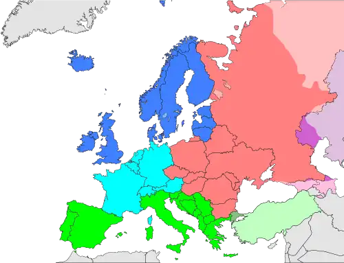 В советское время деление Европы на Восток и Запад имело зачастую политическую окраску — к Восточной Европе относили ГДР, Польшу, Чехословакию, Венгрию, Румынию, Болгарию, Албанию, Югославию и СССР — страны социалистические, или, как их ещё называли, «страны народной демократии». К Западной Европе относились все остальные государства. При этом Испания, Португалия, юг Франции, Италия, Мальта, Кипр, Греция и Турция также назывались Южной Европой, а Исландия, Норвегия, Швеция, Дания и Финляндия — Северной[47].