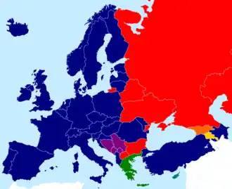 В период после Второй мировой войны до 1989—1991 Европа была центральной ареной холодной войны между западным (капиталистическим) и восточным (социалистическим) блоками. Большинство стран Западной Европы в это время в военно-политическом плане объединилось в рамках НАТО. Социальную и правовую интеграцию обеспечивал Совет Европы, экономическую — Европейское экономическое сообщество. На востоке континента военной интеграционной структурой выступала Организация Варшавского договора, экономической — Совет экономической взаимопомощи; в обеих доминирующую роль играл СССР[50].