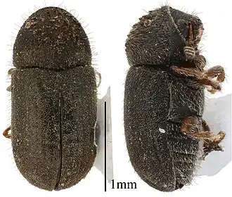 Длина тела жуков 1,8-2,1 мм. Булава усиков с тремя изогнутыми швами, с грубыми и длинными щетинками. Жгутик усика состоит из четырёх члеников. Переднеспинка и надкрылья темно-коричневые или черные. Скат переднеспинки с многочисленнымм (более 47) хаотично расположенными выступами, из них по переднему краю расположены 2-6 выступов. Шов между переднеспинкой и надкрыльями с небольшой выемкой. Поверхность надкрылий гладкая. Бороздки на надкрыльях с рядами точек, каждая точка с короткой волосковидной щетинкой[2].