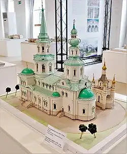 Ещё до сноса старой церкви Горная администрация заказала разработку проекта нового каменного храма у петербургского архитектора Иоганна Вернера Миллера (нем. Müller). Его проект 1743 года в стиле западноевропейского барокко предполагал строительство трёхпридельного храма с трёхъярусной квадратной в плане колокольней и шестигранным куполом над центральной частью. Боковые приделы Миллер спроектировал внутри центрального нефа, в то время как в архитектуре русских храмов того времени стандартным приёмом была пристройка боковых приделов отдельными объёмами[4][12][19][20][a 2].