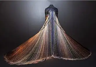 Оригинальное плетение создаёт неповторимую и зыбкую поверхность со сложной цветовой гаммой и тонкими переходами оттенков, сравнимую с живописным холстом. Но в отличие от него, могут изменять свою форму, создавая объёмы, движущиеся в пространстве вместе с моделью. Арт-полотна представляют собой уникальное явление современного искусства, объединяющий в себе живопись, текстиль и моду.