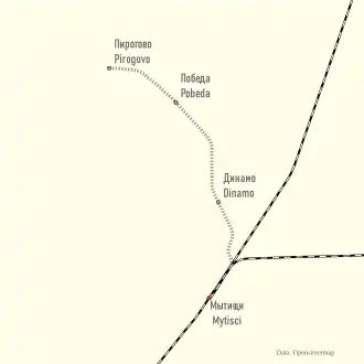- В деревне Высоково на Пироговском шоссе — Железнодорожная улица, расположенная в нескольких сотнях метров от просеки Пироговского лесопарка, по которой пролегала насыпь.