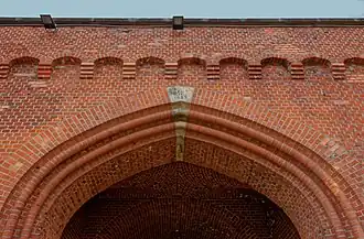 Железнодорожные ворота имеют два пролёта, оформленных арками стрельчатых очертаний. Порталы ворот оформлены фасонным фигурным кирпичом. По бокам от арок размещены казематы с амбразурами и бойницами. С внешней стороны ворот имеется кордегардия, имеющая мощные амбразуры для артиллерии и бойницы для стрелков.