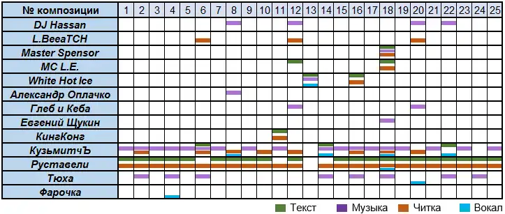 - Тюха (гитары, бас, клавиши; для 2, 4, 6, 14, 16, 18, 22 и 24 дорожек);