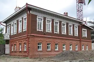 Первый этаж кирпичный, второй составляют полукруглые брёвна, рубленные «в обло» и обшитые профилированной доской (за исключением северного фасада). Врубки скрыты за вертикальными досками.