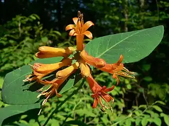 Цветки жёлто-оранжевые, длиной 2-4 см, трубчатые. Собраны в мутовку на конце побегов над дисковидными листьями. На цветках этого вида жимолости кормятся некоторые виды колибри, выступая в роли его опылителя.[2]