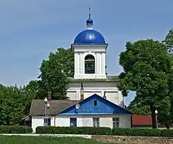 Построена в 1672 году, освящена в честь Рождества Богоматери. Прямоугольный в плане объём церкви накрыт двухскатной крышей с деревянным барабаном и куполом в средней части. Главный фасад оформлен пучками волют, выступает за пределы объёма полуколонн и фигурным фронтоном и закрывает боковые стены церкви. Остальные фасады сдержанно обработаны лопатками, простыми карнизами и обрамлением окон.