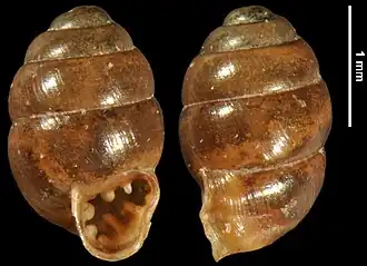 Раковина от овальной до почти удлинённо-овальной, относительно тонкостенная, просвечивающая, блестящая, с сужающимся завитком, состоит из 4—5 оборотов. Высота раковины 1,7—2,3 мм, ширина 1,2—1,4 мм. Высота устья 0,45—0,65 мм, ширина 0,63—0,88 мм. Обороты обычно умеренно выпуклые, шов умеренно глубокий, реже обороты сильно выпуклые, а шов глубокий. Последний оборот к устью отчётливо приподнят, его высота немного больше половины высоты раковины. Окраска красновато-коричневая, обычно тёмного оттенка, зубы несколько светлее. Эмбриональные обороты почти гладкие. Дефинитивные обороты покрыты очень слабыми неравномерными радиальными морщинами. Устье сердцевидное, с глубокой палатальной выемкой. Базальный и колумеллярный края устья отвёрнуты. Губа обычно есть. Зубов 6—11: 2—4 париетальных, 1—2 колумеллярных, 1 базальный, 2—4 палатальных. Мозоль присутствует на всей поверхности базальной и палатальной стенок, выражена в различной степени (обычно сильно), вместе с палатальными зубами видна сквозь раковину. Затылочное утолщение хорошо выражено и особенно сильно развито на базальной стенке и на нижней части палатальной стенки. На внешней поверхности палатальной стенки есть два углубления, соответствующие основным палатальным зубам. Между затылочным утолщением и краем устья есть две небольшие ямки, одна из которых соответствует палатальной выемке и хорошо заметна, а другая находится ниже и может быть слабо выраженной. Пупок закрыт[5][6][7].