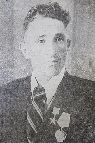 - Герой Социалистического Труда (Указ Президиума Верховного Совета СССР от 16 апреля 1949 года, орден Ленина и медаль «Серп и Молот») — за получение высоких урожаев ржи, хлопка и табака при выполнении колхозами обязательных поставок и контрактации по всем видам сельскохозяйственной продукции, натуроплаты МТС в 1948 году и обеспеченности семенами всех культур в размере полной потребности для весеннего сева[9].