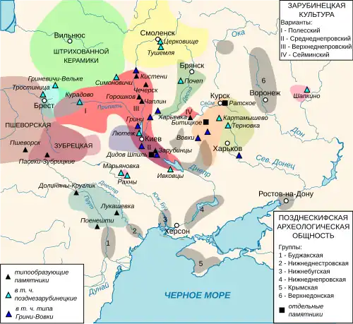 В 40-х и 50-х годах XX века на территории Киева и окрестностей был изучен ряд поселений и могильников зарубинецкого облика, датированных I—V веками н. э. Археолог В. Н. Даниленко назвал их «позднезарубинецкими памятниками киевского типа», решив, что именно они отражают один из этапов этногенеза славян. В наши дни памятники, подобные описанным Даниленко, принято делить на позднезарубинецкие I—II веков и киевские III—V веков[39][40]. Как полагают А. М. Обломский и Р. В. Терпиловский, позднезарубинецкие памятники не составляют единой культуры, отражая собой ряд общностей, связанных лишь близостью происхождения[41]. М. Б. Щукин предложил именовать памятники середины I — начала II века, занимающие обширные территории от верховьев Десны до верхнего Поднестровья (в том числе зубрицкую группу и могильники типа Звенигород-Гринев), постзарубинецкими или горизонтом Почеп-Лютеж-Рахны[42][43]. С. В. Воронятов делит постзарубинецкие памятники на два горизонта: Рахны-Почеп (середина I — первая четверть II века) и Картамышево II (вторая половина — конец II века)[44].
