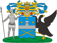 Щит увенчан дворянским шлемом и короной. Намёт на щите голубой, подложенный золотом. Щитодержатели: с правой стороны воин с копьём, а с левой стороны чёрный одноглавый орёл.