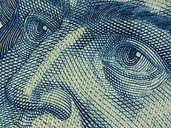 Лицевая сторона (фрагмент) банкноты 20 долларов с маркированными «кольцами Омрона» (как часть числа 20)