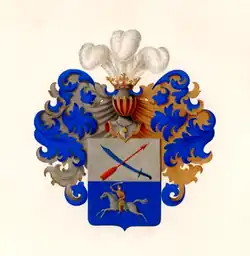 Щит увенчан дворянскими шлемом и короною. Нашлемник: три серебряных страусовых пера. Намёт справа лазоревый, с серебром, слева лазоревый с золотом.